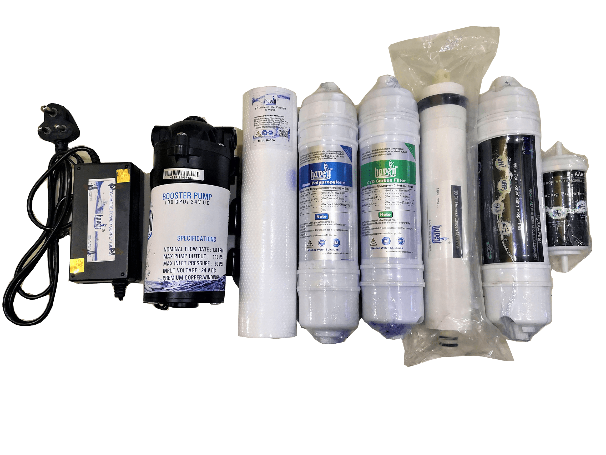 All Major RO Spare Parts like Power Supply, Booster Pump, Spun Filter, Sediment Filter, Carbon Filter, RO Membrane and Alkaline Filter are made from high grade material in our own Brand as shown in picture.